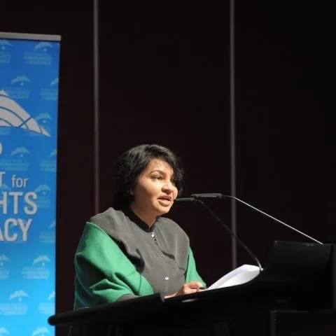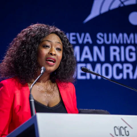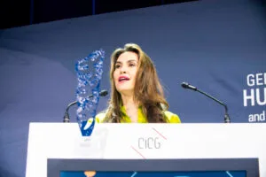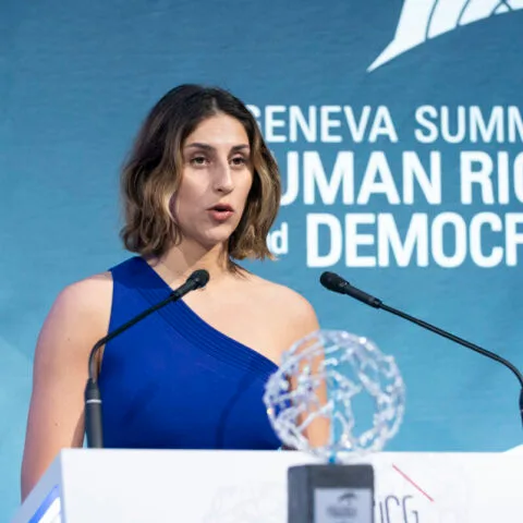 Nazanin Afshin-Jam, Iranian-Canadian human rights and democracy advocate, presents the International Women’s Rights Award at the 17th annual Geneva Summit for Human Rights and Democracy to Afghanistan’s former Minister of Women’s Affairs and first woman to run for president Massouda Jalal, and her activist daughter, Husna Jalal, on behalf of all Afghan women’s rights activists.