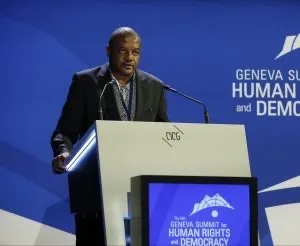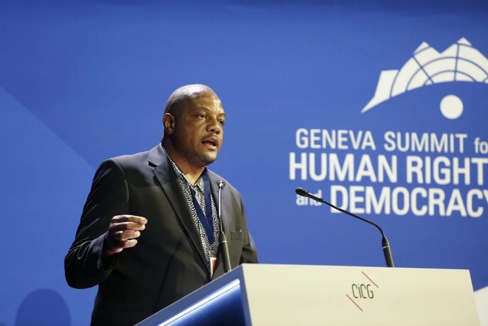 Oft-imprisoned Zimbabwean investigative journalist Hopewell Chin’ono addressess the 14th Annual Geneva Summit for Human Rights and Democracy – see quotes below, followed by full prepared remarks.